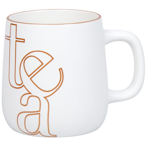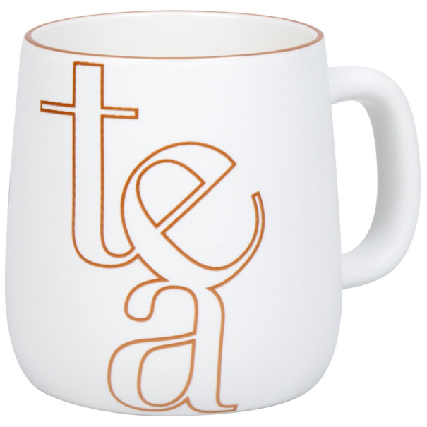 Startest du deinen Tag am liebsten mit einem fruchtigem Tee und einer Portion Stil? Dann ist dieser weiße Becher wie für dich gemacht! Das matte Finish verleiht ihr eine elegante, moderne Ausstrahlung, während die kupferfarbene Typografie mit dem Wort tea in übergroßem, kunstvollem Design zum absoluten Hingucker wird. Die geschwungenen Linien des Schriftzugs verleihen der Tasse einen edlen, fast schon grafischen Charakter perfekt für Designliebhaber mit Geschmack.