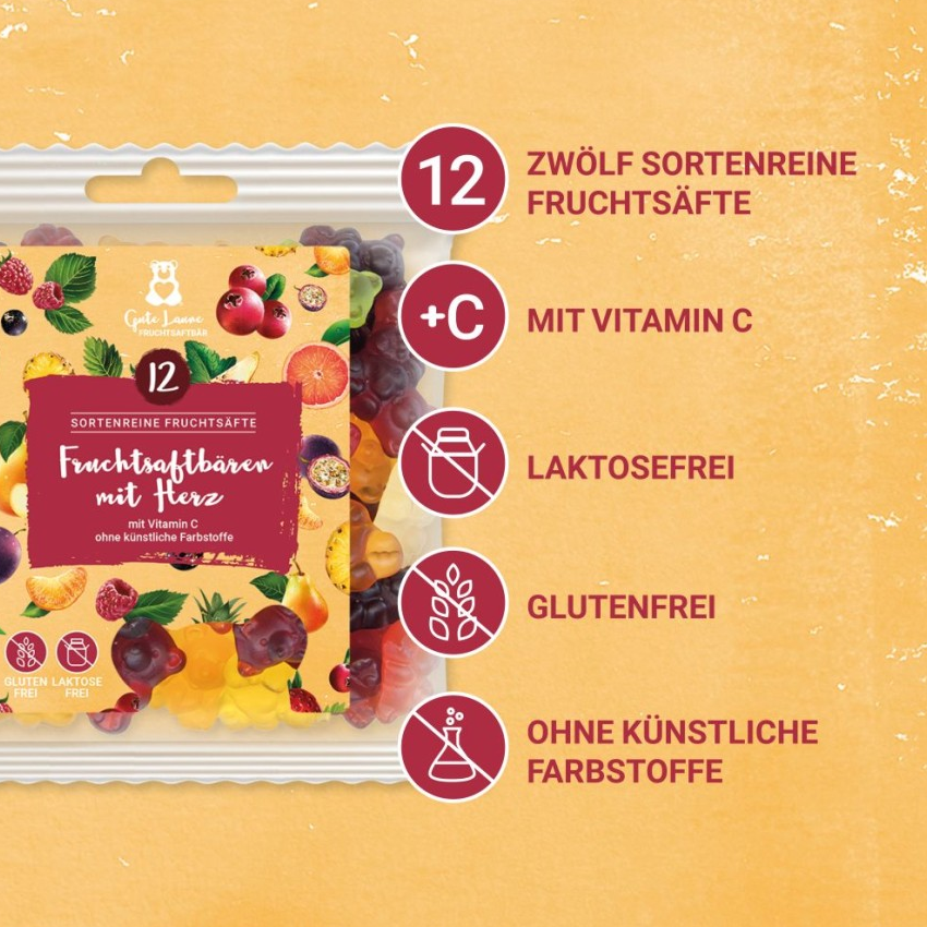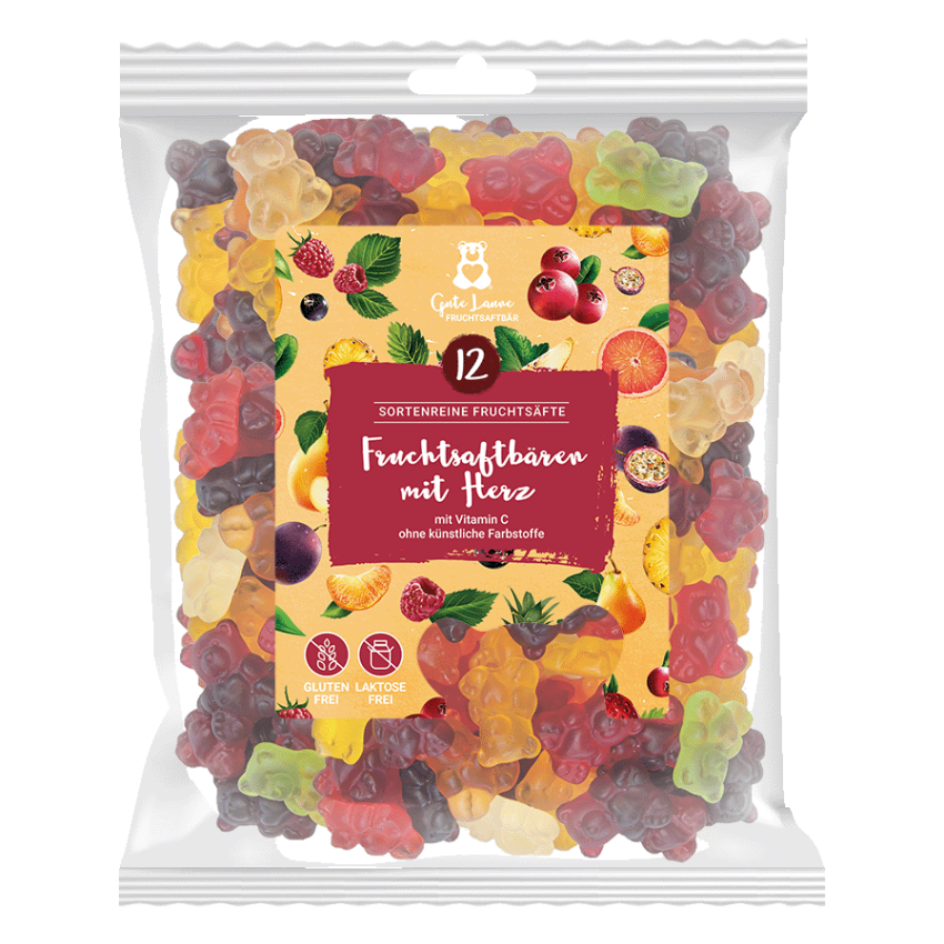 Fruchtgummis Fruchtsaftbär mit Herz sind große Gummibärchen mit Herzmotiv, hergestellt aus 12 sortenreinen Fruchtsäften mit einem hohen Fruchtsaftanteil von 20–40 %. Sie sind gluten- und laktosefrei, ohne künstliche Farbstoffe und mit Vitamin C verfeinert – eine fruchtige Nascherei für Groß und Klein oder als liebevolle Beigabe zu Geschenken.